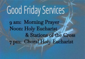 Good Friday: April 3 at St. Clare’s. Morning prayer at 9 a.m. We will celebrate Holy Eucharist at noon, followed by Stations of the Cross, and Holy Eucharist with music and choir at 7 p.m.