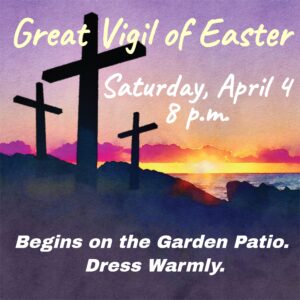 The Great Vigil of Easter: Saturday, April 4 at 8 p.m. Please bring warm clothes and a flashlight as this service begins in darkness on St. Clare’s garden patio. As we tell the stories of God’s movement through creation and humanity, we’ll provide warm beverages and blankets to see us through our vigil as we light the new fire, then move into the sanctuary.